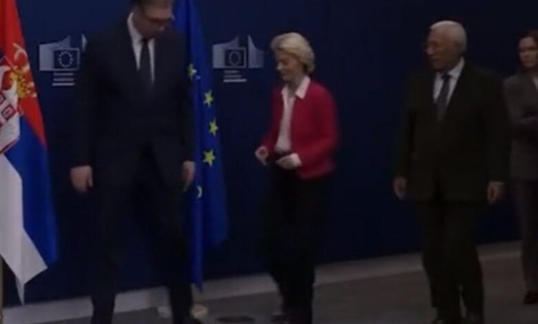 Kratka, ali simbolički snažna razmjena između predsjednika Srbije Aleksandra Vučića i predsjednice Europske komisije Ursule von der Leyen, zabilježena sinoć pri njegovom dolasku u Bruxelles, odmah je privukla pažnju evropskih medija.