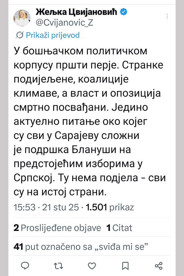 – “U bošnjačkom političkom korpusu pršti perje. Stranke podijeljene, koalicije klimave, a vlast i opozicija smrtno posvađani. Jedino aktuelno pitanje oko kojeg su svi u Sarajevu složni je podrška Blanuši na predstojećim izborima u Srpskoj. Tu nema podjela – svi su na istoj strani”, poručila je Cvijanović.