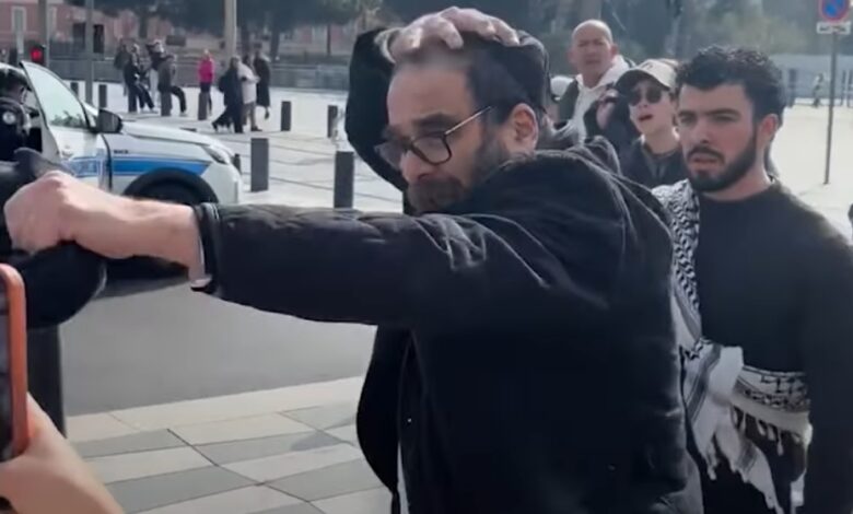 Tokom pro‑palestinskog skupa u Nici, Francuska, snimljeno je kako jedan muškarac izaziva okupljene, a zatim se prikazuje kao žrtva “antisemitskog” napada kada su se pojavili policijski službenici.