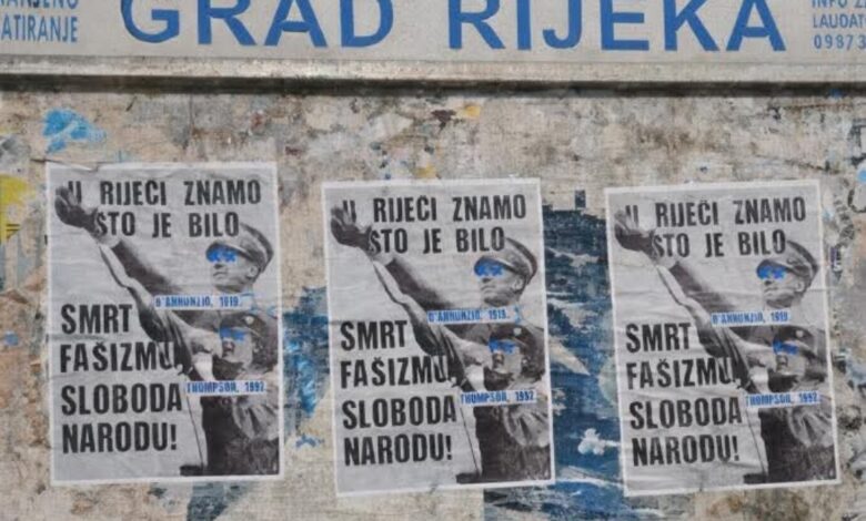 Dan prije velikog koncerta Marka Perkovića Thompsona u Rijeci, grad je probudio neobičan prizor – po ulicama su osvanuli plakati s porukama “Smrt fašizmu, sloboda narodu”. Plakati prikazuju i same izvođače te povijesne ličnosti poput Gabrielea D’Annunzija s rukama podignutim u gestama koje podsjećaju na fašistički pozdrav, što je izazvalo snažne reakcije javnosti.