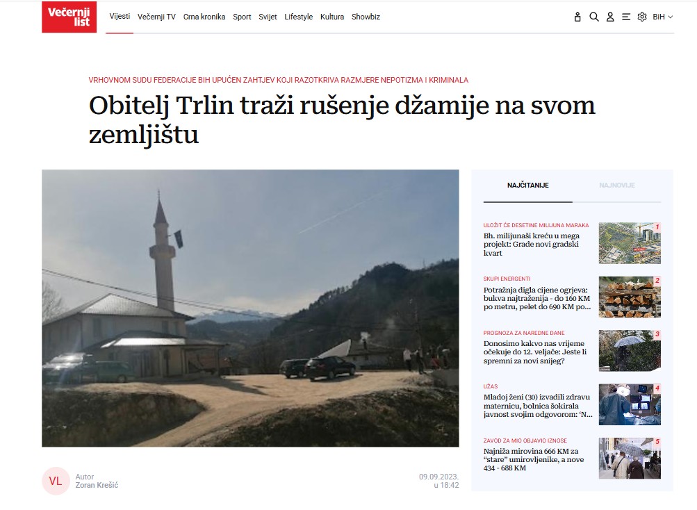 Spor je pokrenut zbog teksta „Obitelj Trlin traži rušenje džamije na svom zemljištu“, objavljenog u septembru 2023. godine u štampanom i online izdanju Večernjeg lista. Sud je zaključio da je članak napisan suprotno osnovnim pravilima novinarske profesije, uz selektivno tumačenje činjenica i tendenciozno povezivanje vjerske zajednice s ekstremizmom.