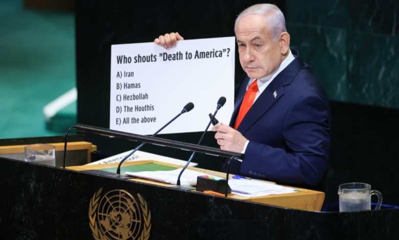 Netanyahu je govor otvorio emotivnim obraćanjem taocima i zatim brzo prebacio fokus na „iransku terorističku osovinu“, vadeći poznatu mapu i označavajući susjedne prijetnje. Govor je bio prošaran optužbama prema Iranu, Hezbollahu, Hutima i Hamasu, a premijer je tvrdio kako su oni „jednako opasni“ — i to je demonstrirao… kvizom pred okupljenima. Držeći poster s pitanje-odgovorima pitao je publiku „Ko viče ‘smrt Americi’?“, ponudivši odgovor „svi navedeni“. Scena je izgledala više kao politički show nego diplomatska rasprava.